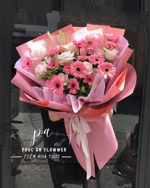 Bó hoa mang vẻ đẹp tươi tắn và ngọt ngào với sự kết hợp hài hòa giữa hoa đồng tiền hồng rực rỡ và hoa hồng kem dịu dàng. Những cánh hoa nở tròn đầy tạo nên cảm giác vui tươi và tràn đầy sức sống, trong khi các nhánh lá xanh và hoa phụ nhỏ giúp tổng thể bó hoa trở nên mềm mại và thanh thoát. Lớp giấy gói hồng nhiều tầng được tạo kiểu bồng bềnh, tôn lên sắc hoa tươi sáng và mang lại vẻ đẹp trẻ trung, lãng mạn.