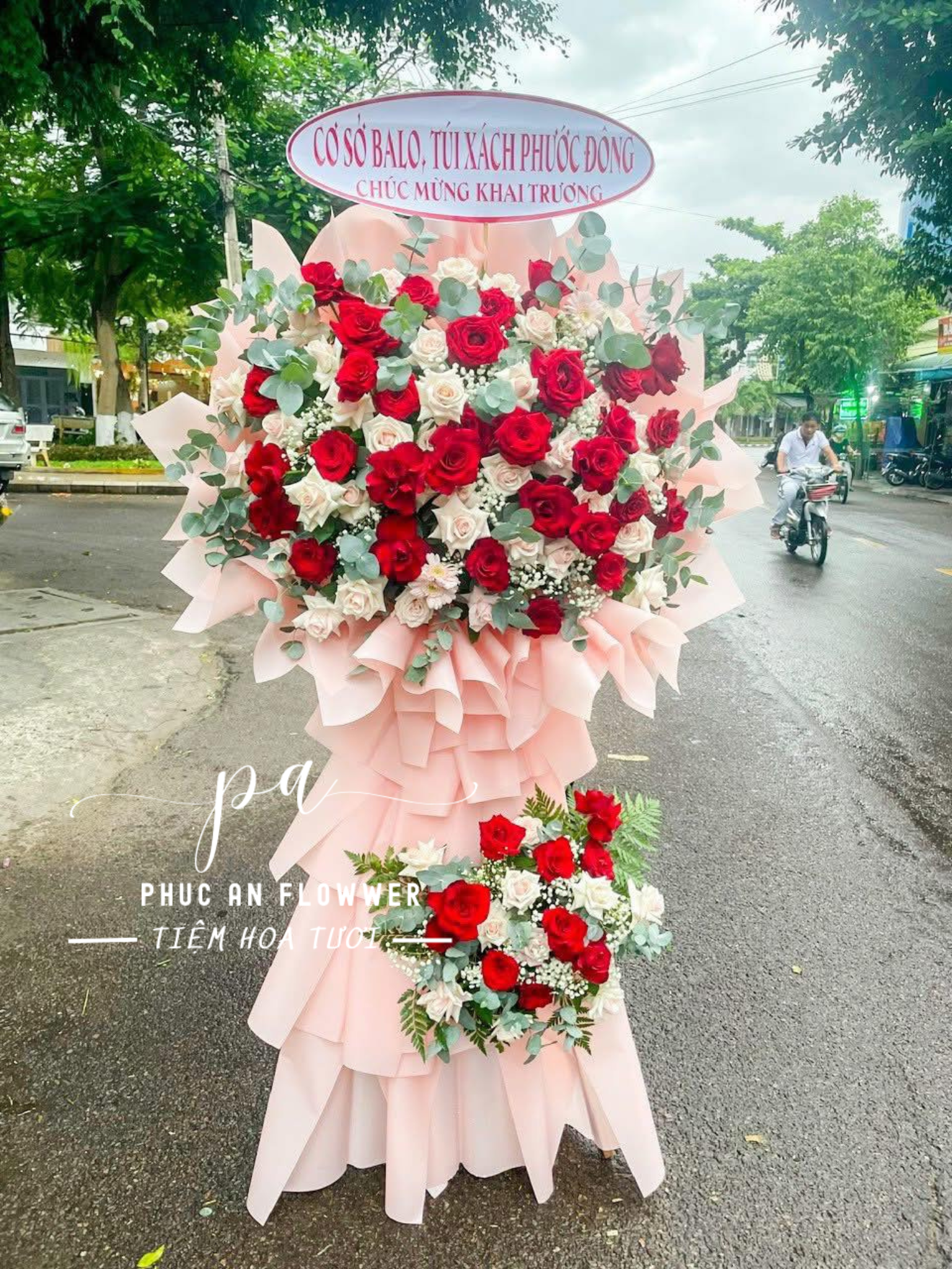 Bố cục hai tầng cân đối, phần chân điểm thêm cụm hoa phụ tạo cảm giác vững chãi và bề thế – rất phù hợp chúc mừng khai trương cửa hàng, công ty, showroom hoặc văn phòng mới. Đây là lựa chọn lý tưởng để gửi gắm lời chúc phát đạt, kinh doanh hồng phát và thịnh vượng dài lâu.