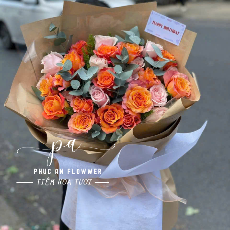 Bó hoa rực rỡ với sự kết hợp hài hòa giữa những đóa hoa hồng cam tươi tắn và hoa hồng pastel dịu dàng, tạo nên tổng thể vừa nổi bật vừa ngọt ngào. Những cành lá bạc xanh điểm xuyết khéo léo giúp bó hoa thêm phần tự nhiên và thanh thoát. Lớp giấy gói tông nâu kem hiện đại làm tôn lên sắc cam ấm áp của hoa, mang đến cảm giác tươi mới và tràn đầy năng lượng.