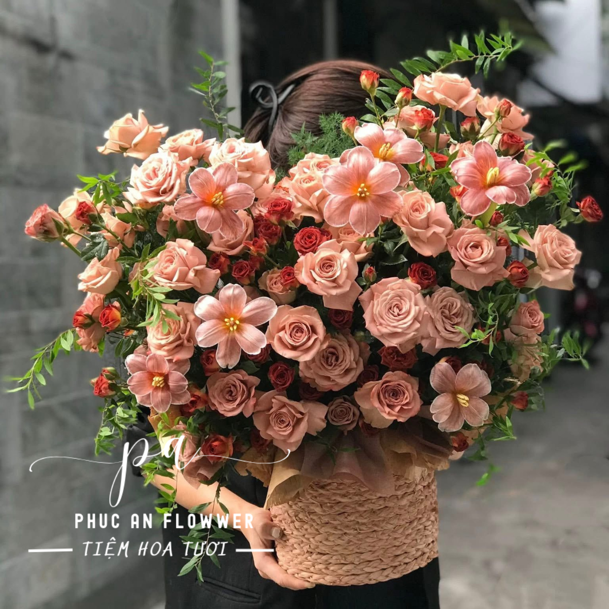 Lẵng hoa mang vẻ đẹp phóng khoáng với những đóa hồng nude dịu dàng hòa quyện cùng các bông hoa điểm sắc cam hồng nhẹ nhàng, tạo nên một tổng thể ấm áp như ánh nắng cuối chiều. Từng cành hoa được sắp đặt tự nhiên, đan xen cùng lá xanh mềm mại, mang lại cảm giác như một khu vườn nhỏ đang nở rộ – vừa tinh tế, vừa đầy sức sống.