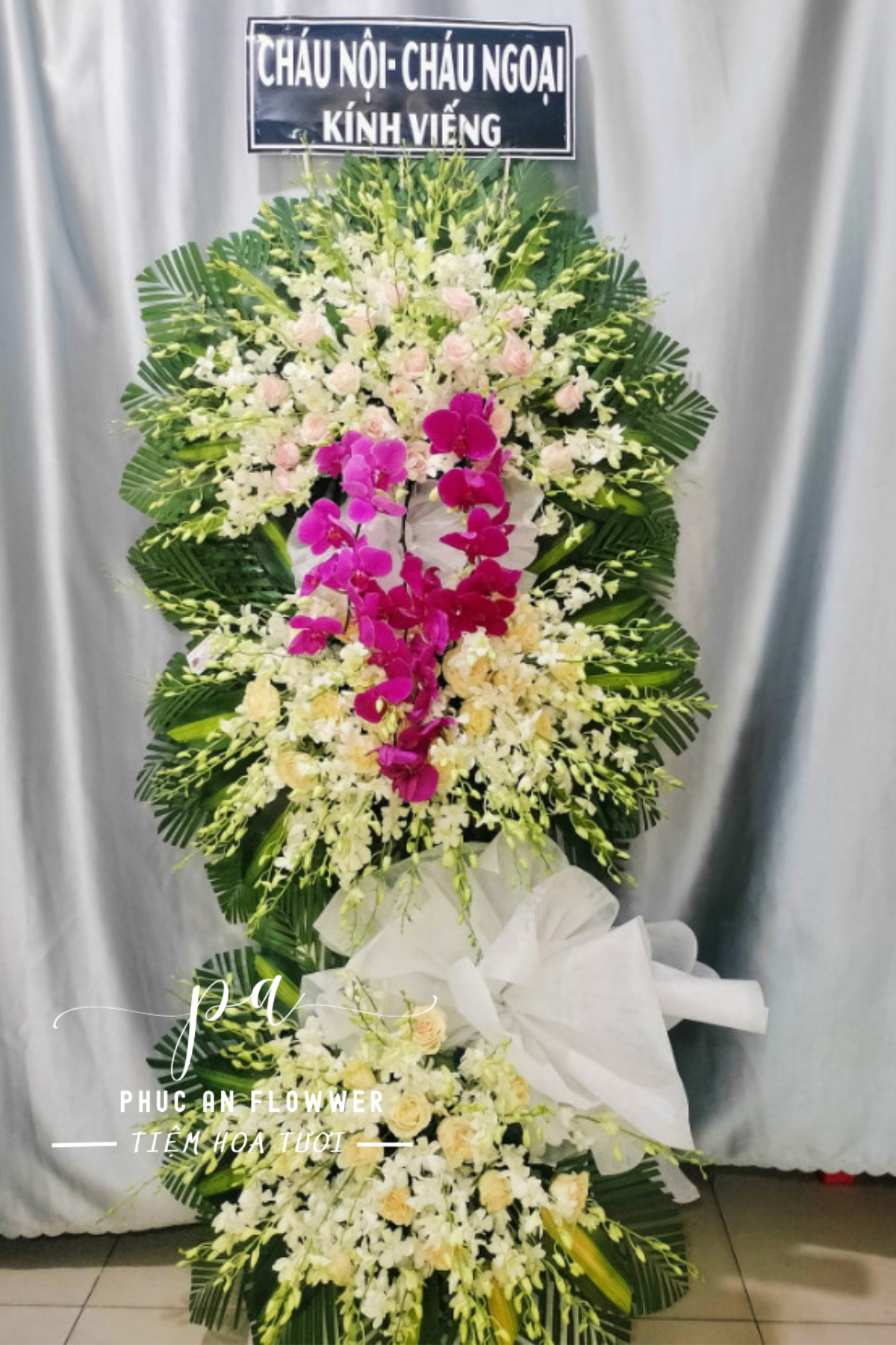 Kệ hoa chia buồn được thiết kế trang nghiêm với nền lá xanh xếp tầng vững chãi, làm nổi bật những đóa lan trắng, hồng kem và lan hồ điệp tím ở trung tâm. Sự kết hợp giữa sắc trắng thanh khiết và điểm nhấn tím trang trọng tạo nên tổng thể hài hòa, vừa trang nhã vừa sâu lắng. Những nhánh hoa nhỏ tỏa đều quanh kệ như những lời tưởng nhớ lan tỏa, mang lại cảm giác trang nghiêm và thành kính.