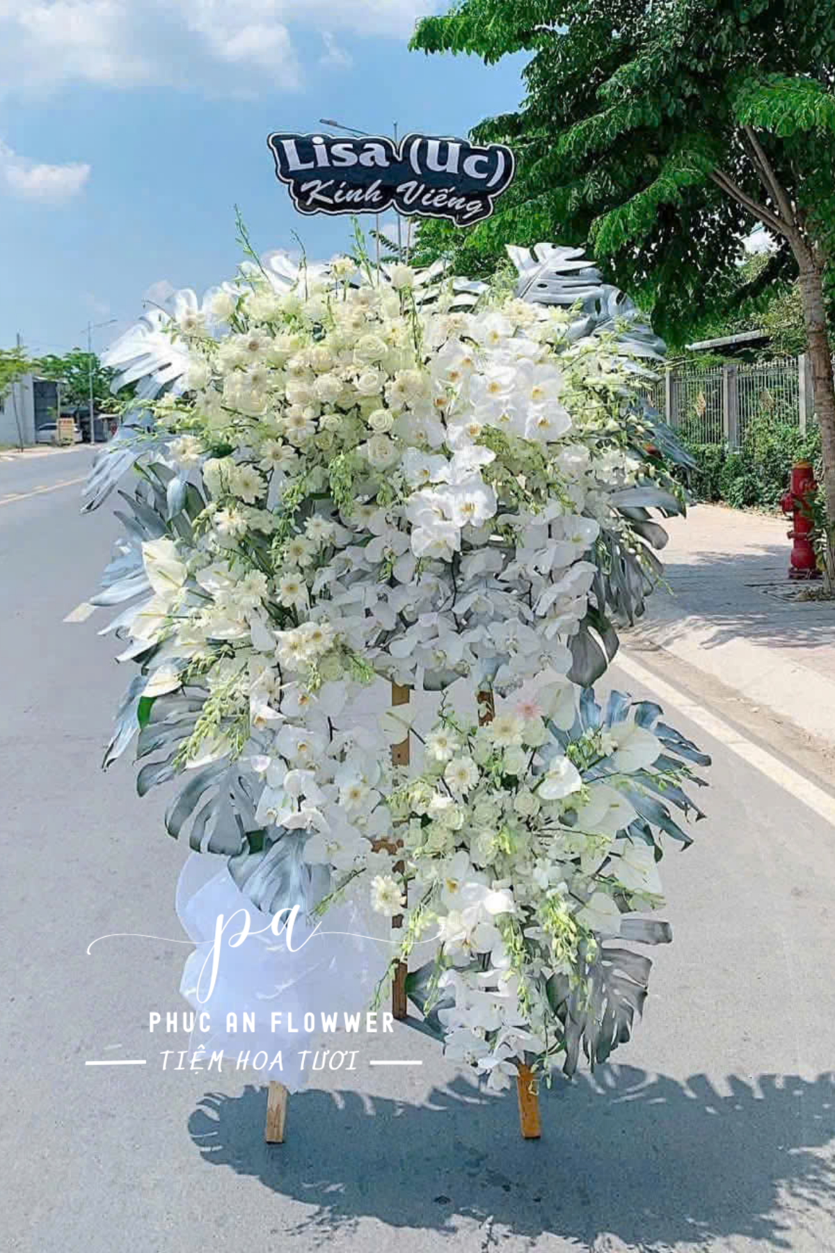 Kệ hoa chia buồn nổi bật với sắc trắng thuần khiết của lan hồ điệp, cúc trắng và những đóa hồng kem dịu dàng, tạo nên tổng thể thanh tao và đầy trang nghiêm. Gam màu trắng chủ đạo tượng trưng cho sự tiễn đưa an lành, cho lời cầu nguyện nhẹ nhàng gửi đến người đã khuất nơi cõi vĩnh hằng.