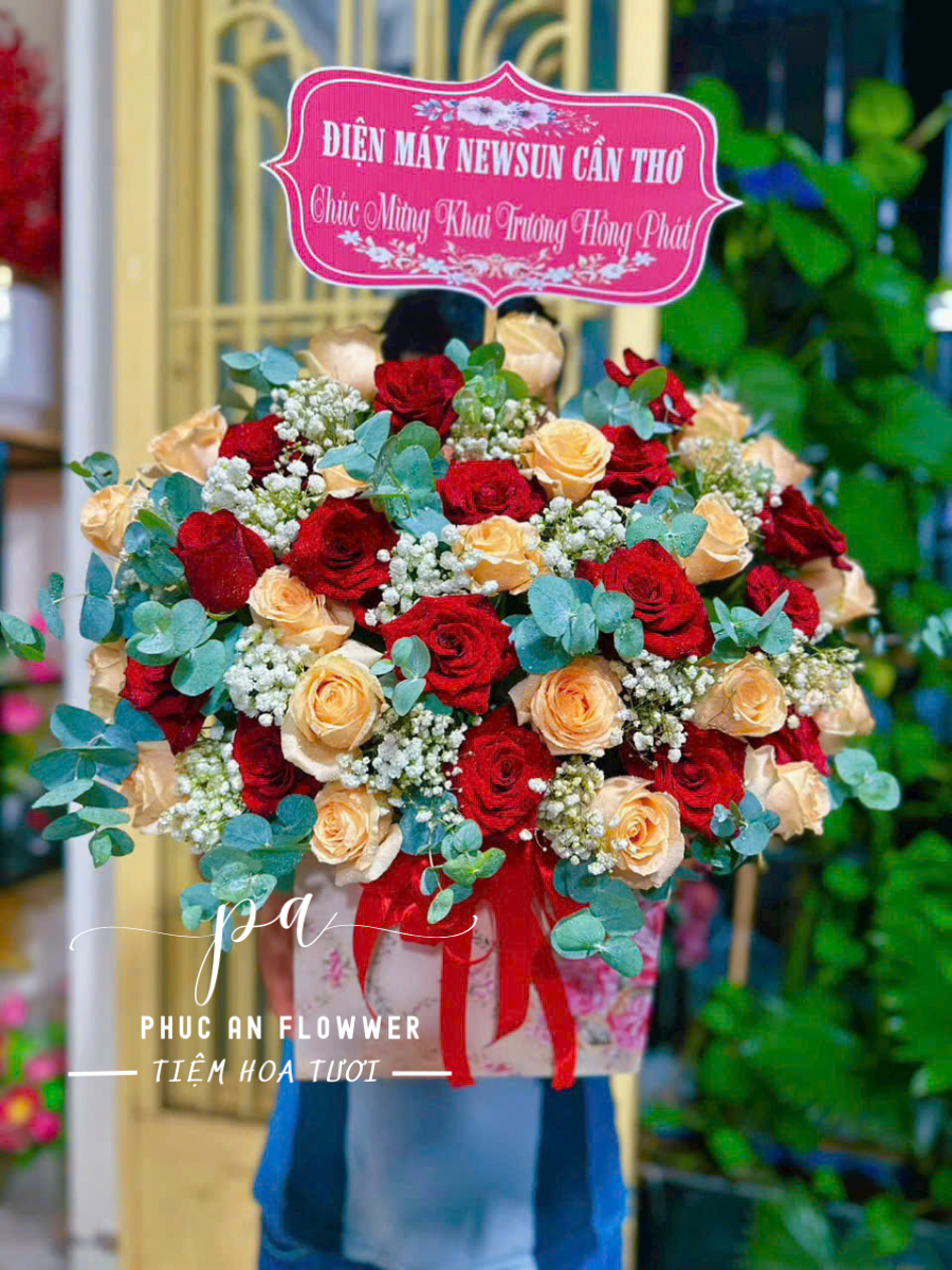 Giỏ hoa nổi bật với sự kết hợp rực rỡ giữa những đóa hồng sắc đỏ nồng nàn và sắc kem thanh lịch, điểm xuyết cùng baby trắng và những nhành lá bạc xanh mềm mại. Tổng thể được sắp xếp dày dặn và tròn đầy, tạo nên cảm giác sang trọng và nổi bật, rất phù hợp cho những dịp chúc mừng quan trọng. Sự tương phản giữa hai gam màu mạnh mẽ và tinh tế khiến giỏ hoa trở nên cuốn hút ngay từ ánh nhìn đầu tiên.