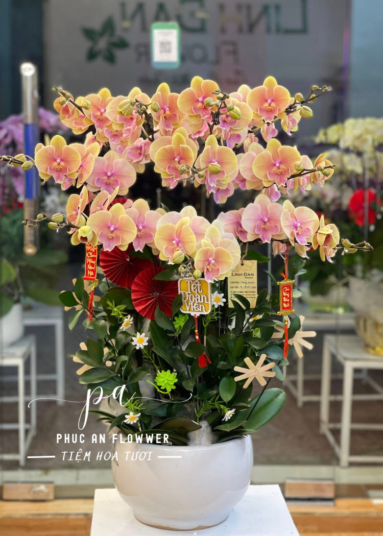 Lan hồ điệp vàng hồng tượng trưng cho sự sum vầy, thịnh vượng và may mắn trong năm mới. Chậu hoa không chỉ thích hợp để trưng bày trong phòng khách, sảnh công ty hay cửa hàng mà còn là món quà ý nghĩa dành tặng người thân, bạn bè, đối tác với lời chúc một năm mới bình an, phát tài và hạnh phúc.