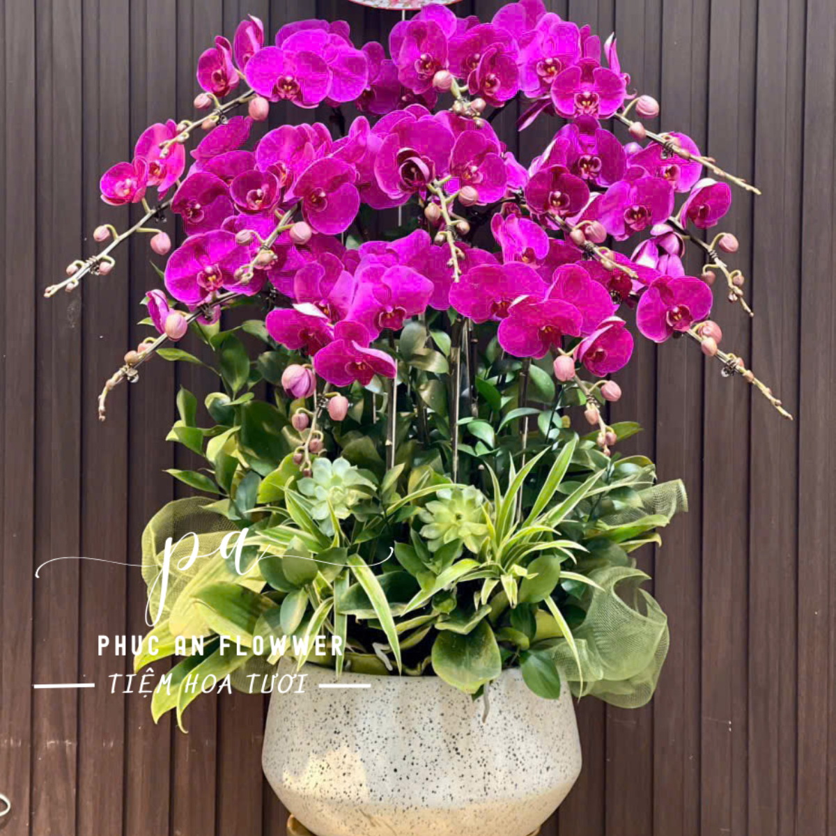 Phần gốc được phối cùng cây lá xanh, sen đá và tiểu cảnh, đặt trong chậu sứ cao cấp, mang đến tổng thể hài hòa và đẳng cấp. Chậu lan đặc biệt phù hợp để khai trương cửa hàng, công ty, mừng tân gia, biếu đối tác, chúc mừng năm mới hoặc trang trí không gian sang trọng như sảnh lễ tân, phòng khách, văn phòng.